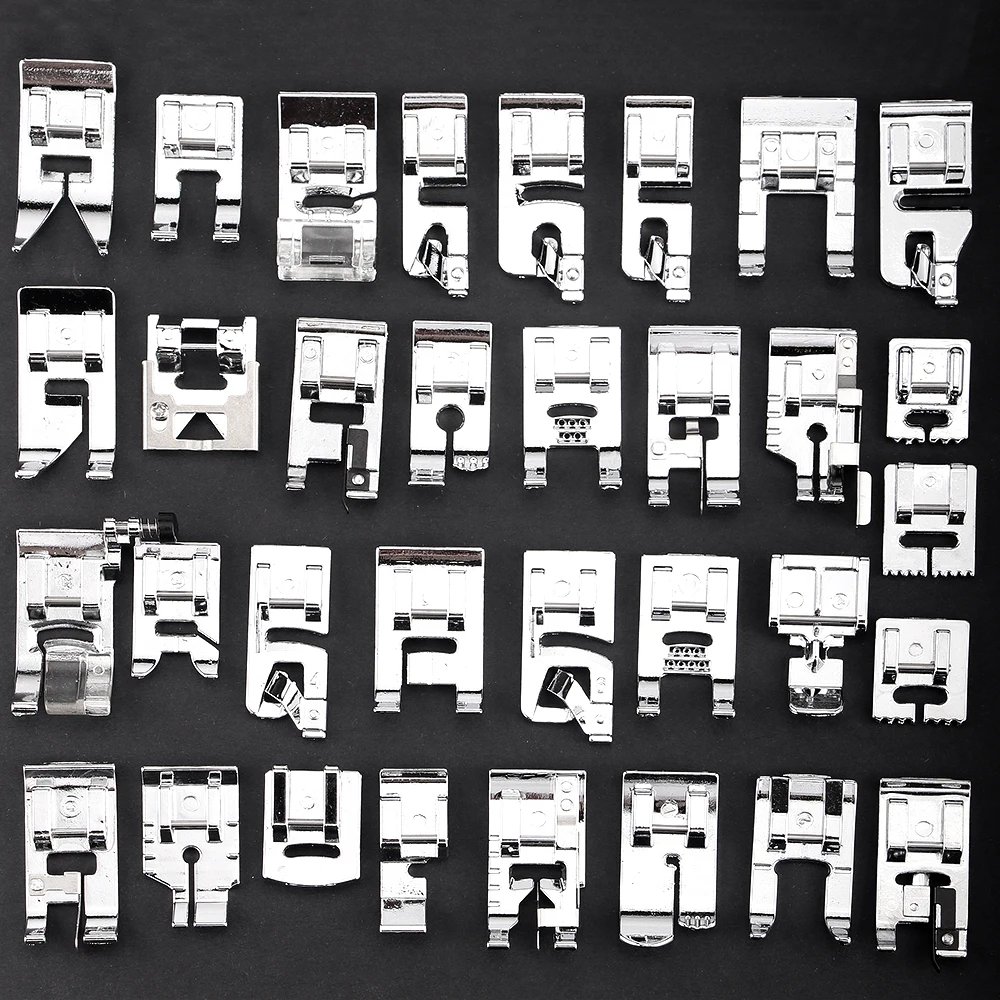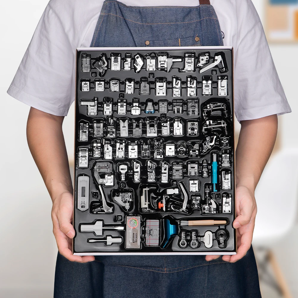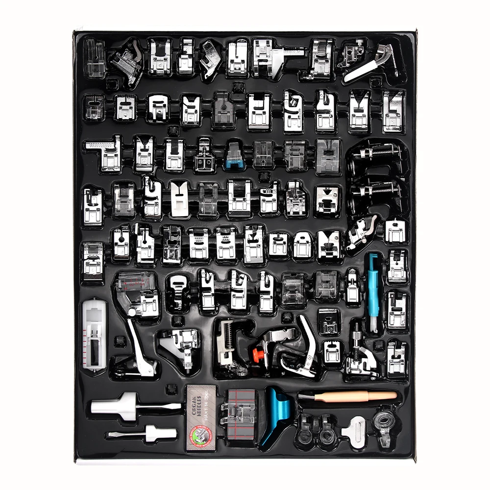 PRESSER FEET KIT --- 82pcs Sewing Machine Presser Feet Adopts high quality metal material, sturdy and durable. Fits for most Brother, Singer, Janome, New Home, Elina, Pacesetter, Elnita, Pfaff, Viking, Juki, Kenmore.