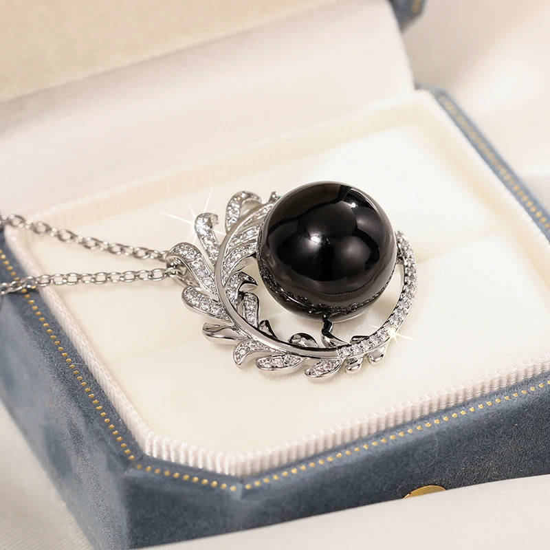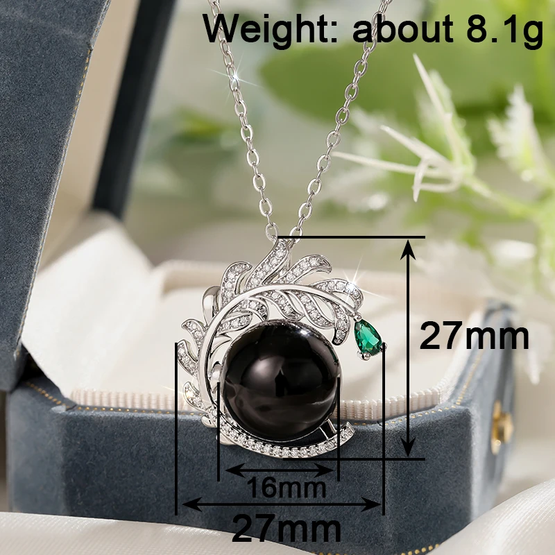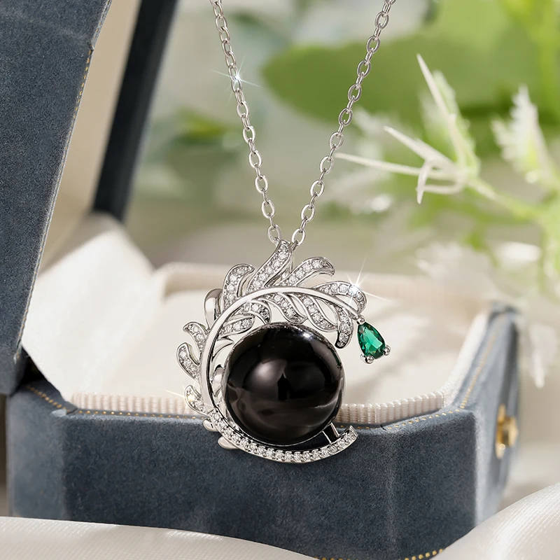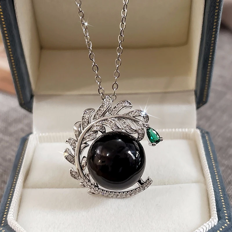 Huitan Aesthetic Branch Design Pendant Necklace with Black Imitation Pearl Pear Green CZ Luxury Trendy Wedding Jewelry for Women